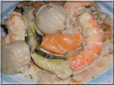 • Ajoutez les Saint-Jacques, les grosses crevettes et les légumes.