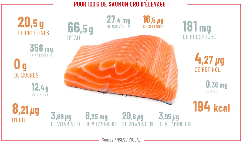 Le saumon a toute sa place dans le cadre d’un rééquilibrage alimentaire, tout en apportant cette touche « plaisir » si importante lors d’un régime. Suivez les conseils de notre nutritionniste, Coralie Costi ! Le saumon est un poisson dit « gras », au même titre que la sardine ou le maquereau. Son rapport protéique est équivalent aux apports de la viande. Pour maintenir un bon équilibre nutritionnel, l’ANSES* recommande de consommer du poisson 2 fois par semaine, en alternant 1 poisson gras (ex : le saumon) et 1 poisson maigre, à hauteur de 100/125 g par personne.