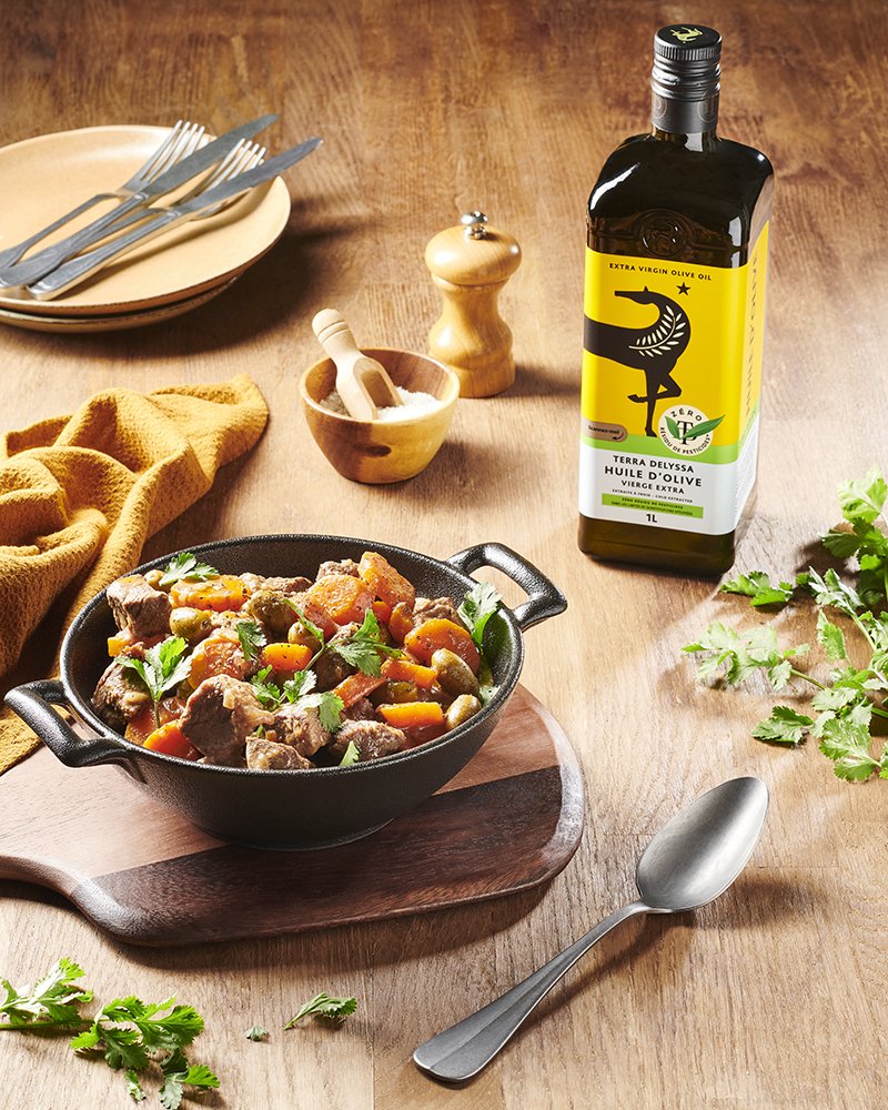 Bœuf confit aux carottes et aux olives, coriandre fraîche