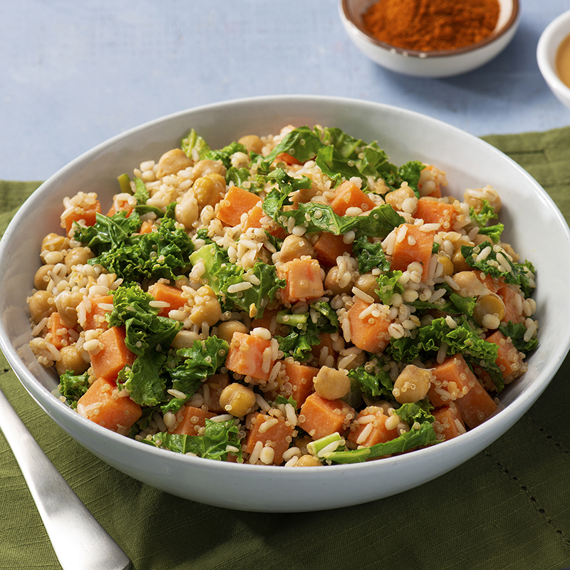 ①• Mélangez ensemble la pâte de tahini, la sauce soja, le jus de citron, l’ail, le sel et le poivre de Cayenne jusqu’à consistance lisse ; mélangez avec le chou frisé, les patates douces et les pois chiches jusqu’à ce qu’ils soient bien enrobés.