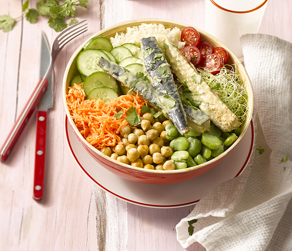 Bol de riz de chou-fleur et filets de maquereaux à la moutarde de Dijon