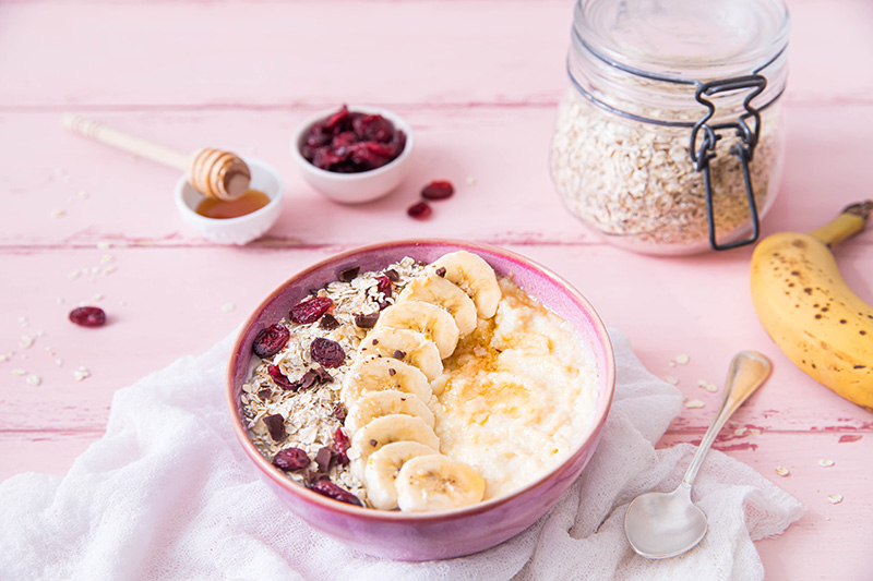 ④• Garnissez des bols de Floraline®. Ajoutez en toppings des flocons d'avoine, cranberries, chuncks de chocolat et rondelles de banane.