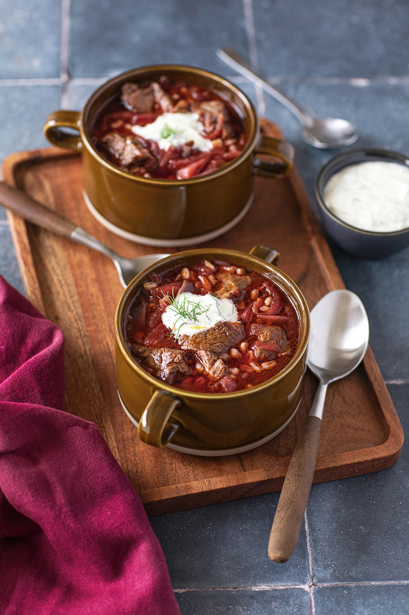 Servir le bortsch dans des bols ou des assiettes creuses, garni d’un peu de crème aigre.