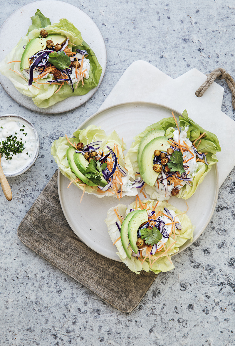 ⑦• Superposer les feuilles de cœur de laitue Florette deux par deux pour former des cups ouvertes.
