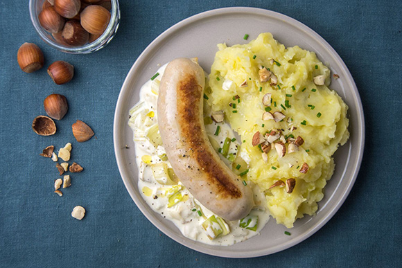 Servez le boudin blanc à la crème accompagné de purée et parsemé de noisettes grillées et de ciboulette.