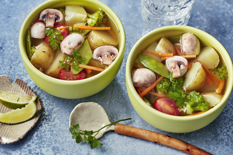 ⑪• Déposez les morceaux de pommes de terre, les tomates cerise, les champignons, les fleurettes de brocoli, et les bâtonnets de carottes dans le bouillon. Ajoutez les tranches de citron vert et prolongez la cuisson pendant 3 à 5 minutes.