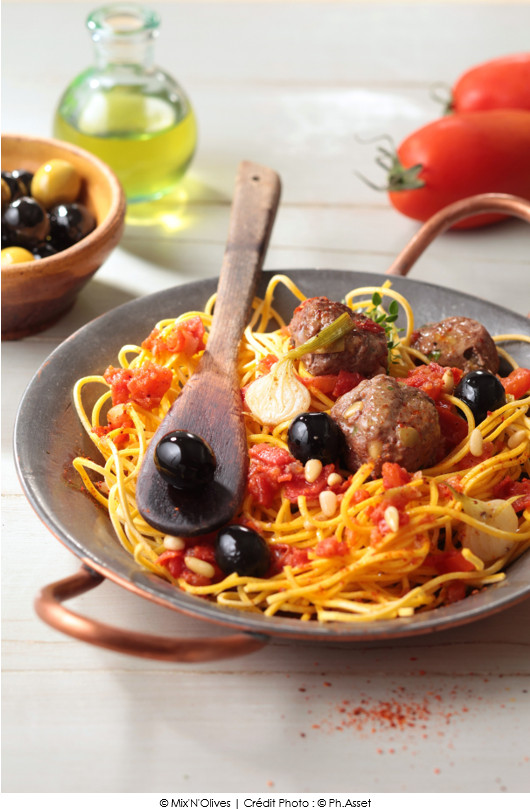 Boulettes de bœuf aux olives vertes, spaghettis aux tomates fraîches et origan