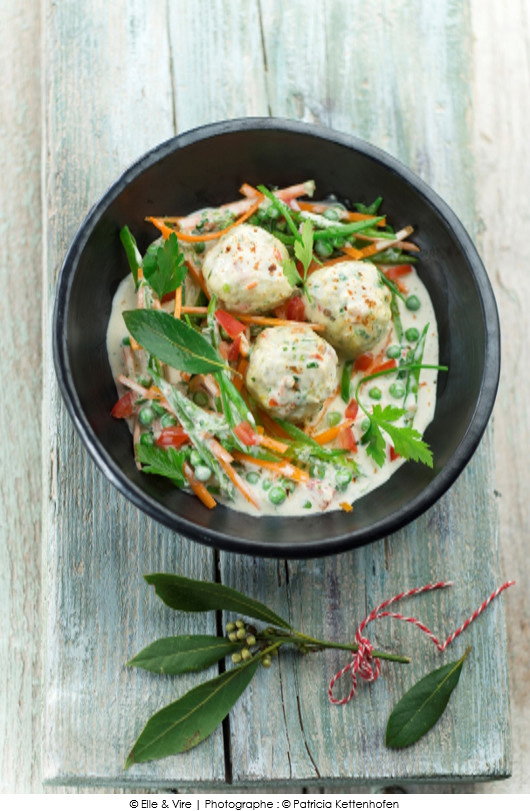 ⑥• Ajouter les boulettes de poisson et les petits pois dans la casserole contenant la préparation à base de crème et laisser cuire 12 min à feu doux. Remuer délicatement puis ajouter les pois gourmands et les carottes. Mélanger et poursuivre la cuisson quelques minutes.