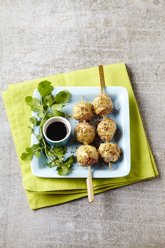 Servir les brochettes de boulettes de veau nappées de la sauce soja et de l’huile de sésame, saupoudrées des graines de sésame et accompagnées de coriandre hachée et de gingembre confit au vinaigre.
