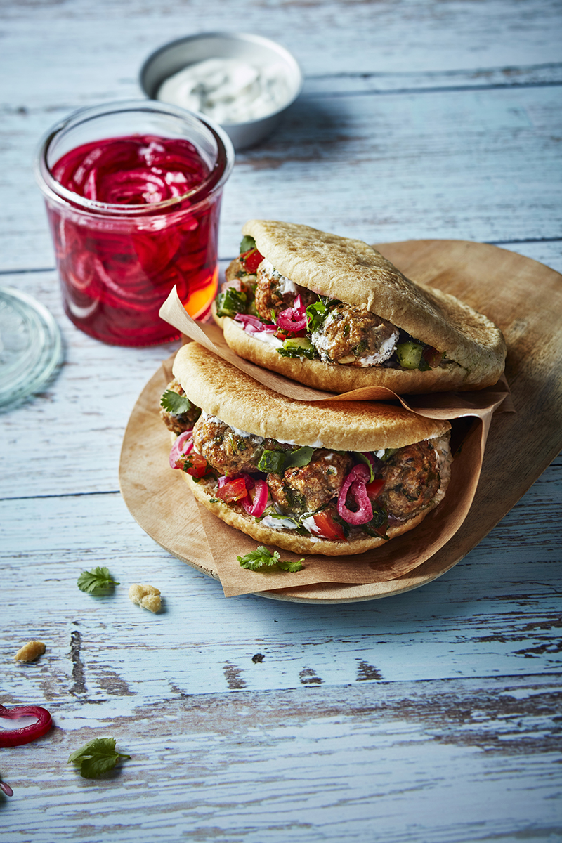 Ajouter un peu de sauce yaourt sur les boulettes, glisser quelques pickles, et agrémenter de quelques pluches de coriandre ou roquette selon l’envie.