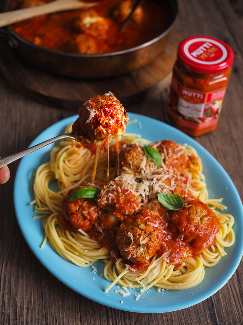 ⑤• Dresser les assiettes en disposant les pâtes, puis en ajoutant les boulettes de viande et la sauce.