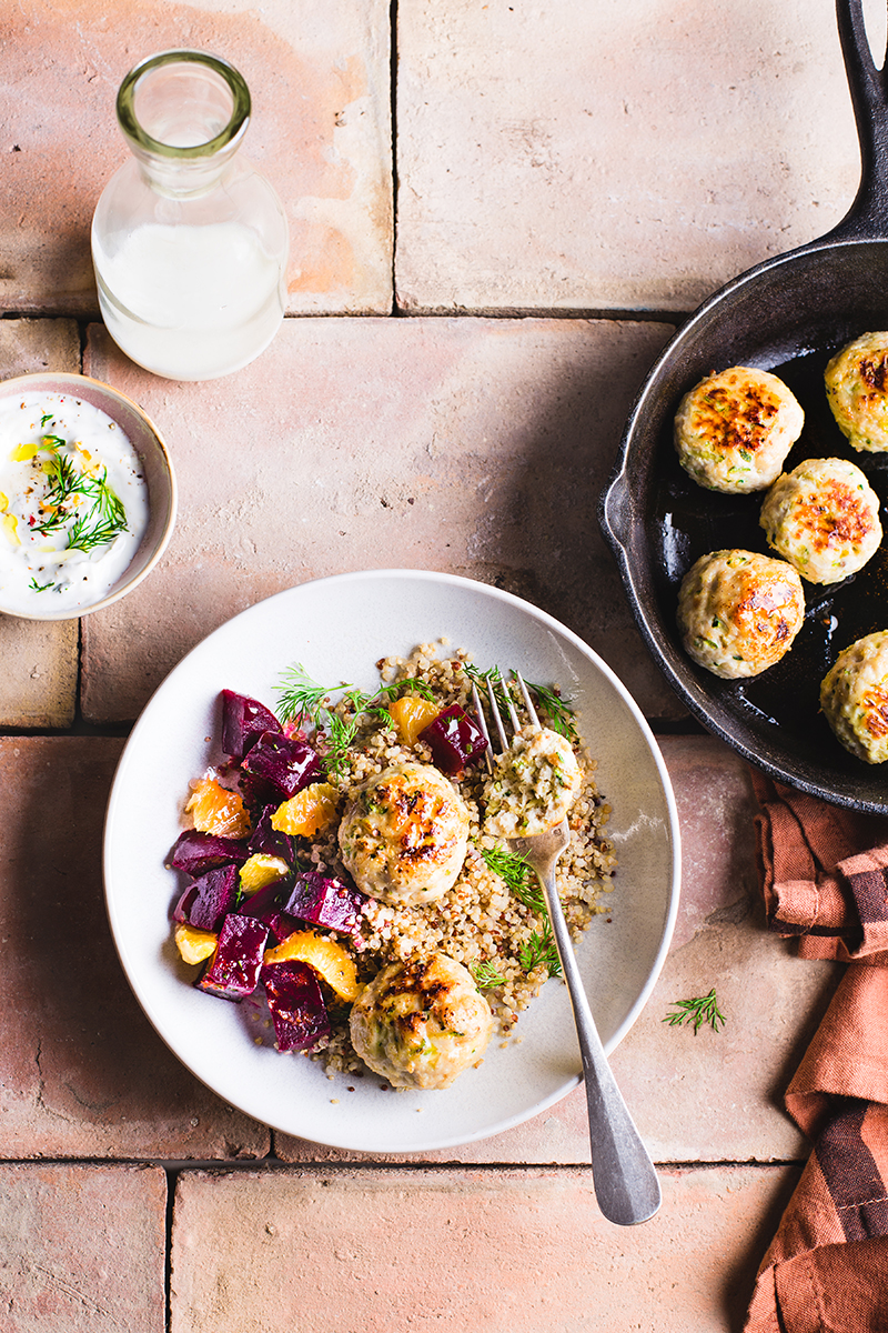 Servez les boulettes avec le quinoa, la salade de betterave et la sauce au yaourt.