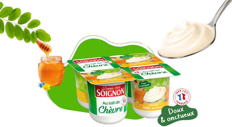 Pour la première fois au rayon des yaourts au lait de chèvre, SOIGNON lance le mariage parfait, presque iconique. La douce saveur du bon lait entier de chèvre 100% français se mêle au miel de fleurs qui apporte une touche sucrée. Sa texture veloutée et onctueuse à souhait apporte une touche délicieuse de fraîcheur. On inscrit d’urgence ce nouveau yaourt SOIGNON au parfum floral sur sa « to doux list » pour le déguster à tout moment de la journée. Une invitation à butiner sans modération tout en se faisant du bien.