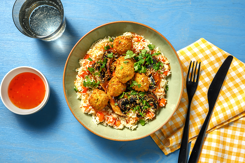 ⑭• Nappez les boulettes de sauce au chili (ça pique ! Dosez-la selon votre goût) et saupoudrez le tout de coriandre et de graines de sésame.