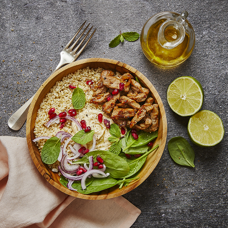 Bowl d’émincé d’épaule d’agneau, aux épinard, houmous et grenade