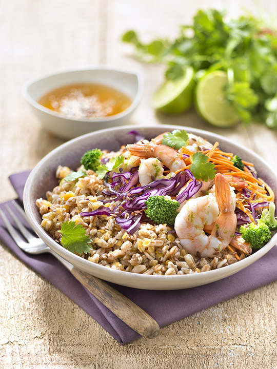 Bowl épeautre, lentilles corail, sésame, crevettes et chou rouge