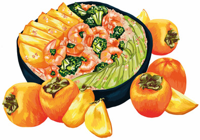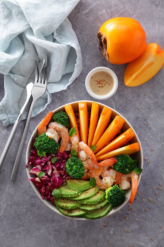 Bowl quinoa, lentilles corail, aux crevettes et Kaki Persimon®