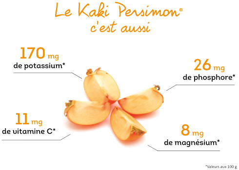 D’une saveur douce et légèrement vanillée, le kaki Persimon®, contrairement au kaki classique, ne révèle aucune astringence. On le croque donc avec plaisir et… sans modération. En effet, outre ses qualités gustatives, le Kaki Persimon® est un véritable atout forme et santé. Avec lui, on fait le plein d’énergie mais aussi d’antioxydants puisqu’il contient un tiers des apports journaliers recommandés en provitamines A (2710 ul*). Exceptionnellement riche en fibres (2,5 g*), il peut également jouer le rôle de coupe-faim et cela, en affichant seulement 66 calories ! Pas de doute, le Kaki Persimon® a tout pour plaire…