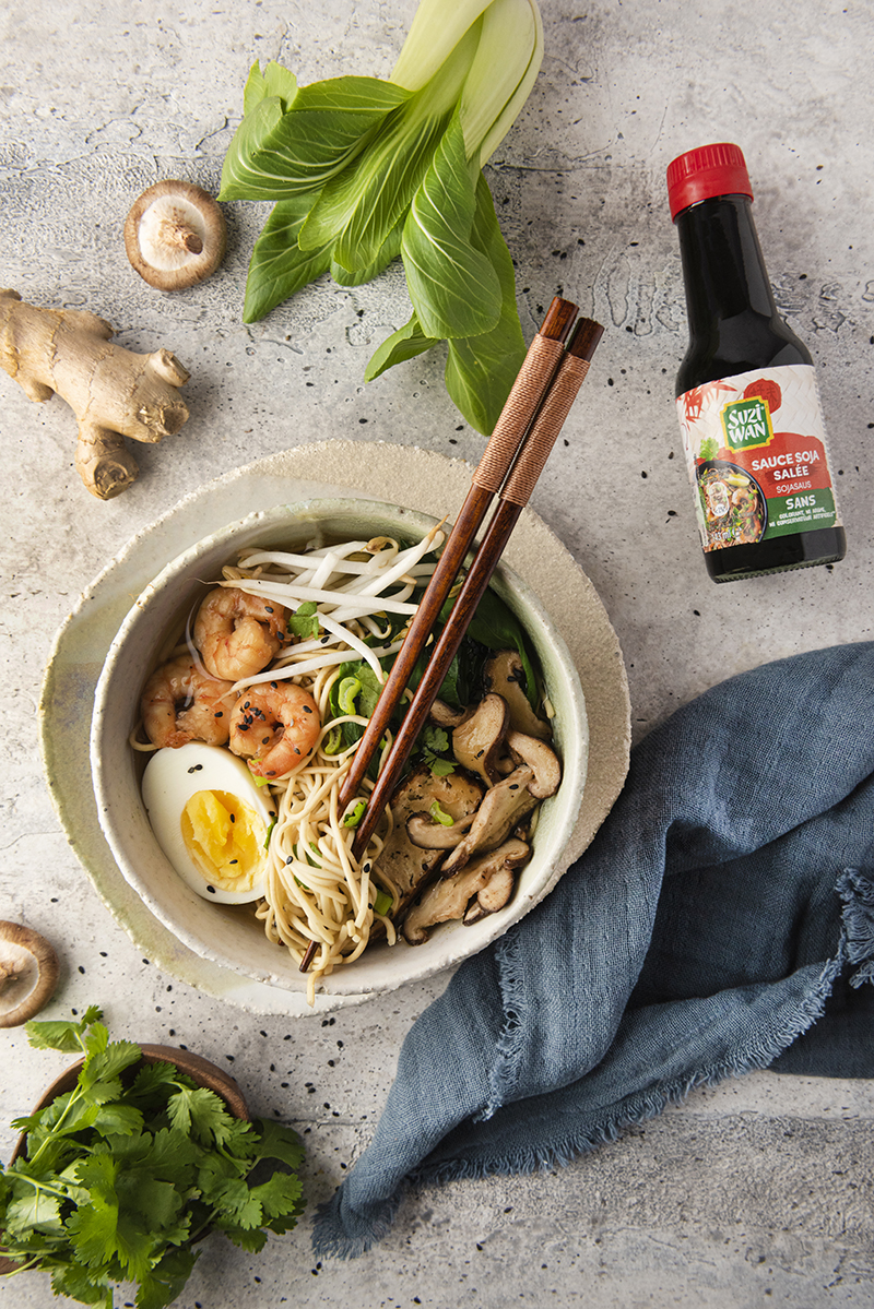③• Dans 1,5 L d’eau, ajouter un cube de bouillon de légumes et la sauce soja Suzi Wan et faire cuire les nouilles. Dans un bol large, dresser les ramen en commençant par le bouillon, les nouilles, les légumes, le tofu, les crevettes poêlées, les œufs mollets coupés en 2 et les pousses de soja frais. Parsemer enfin de coriandre fraîche, d’oignons nouveaux finement taillés et de sésame noir.