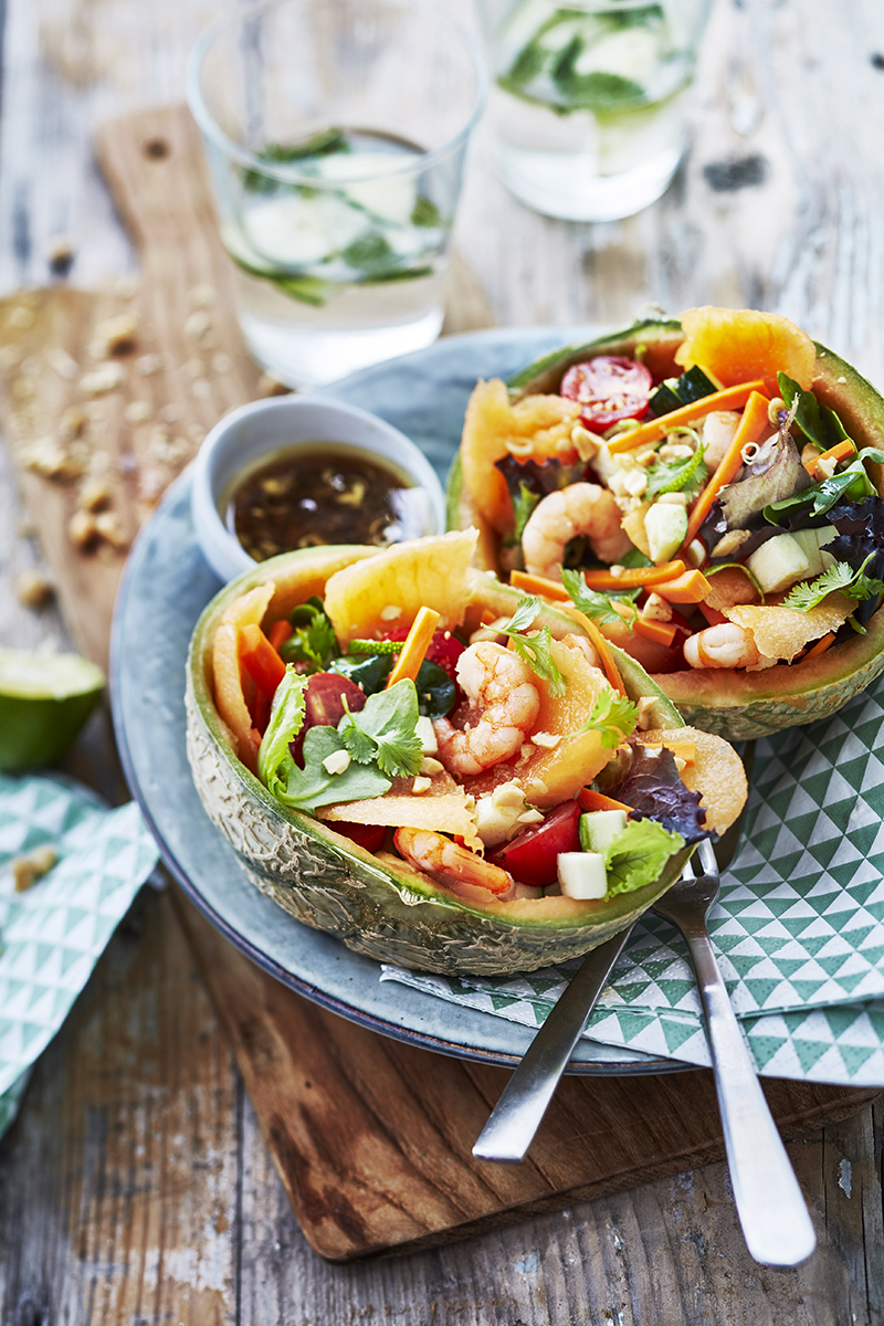 ④• Dans les coques de melon, déposer les pétales de melon, les tomates cerise, les bâtonnets de carottes, les dés de courgettes les jeunes pousses et les crevettes.
