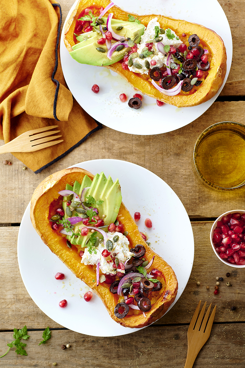 ⑥• Épluchez l’avocat, retirez le noyau et tranchez-le finement. Déposez sur les courges. Ajoutez ensuite du chèvre frais, des rondelles d’olives noires Tramier, l’oignon émincé puis parsemez de graines de grenade et de graines de courges.