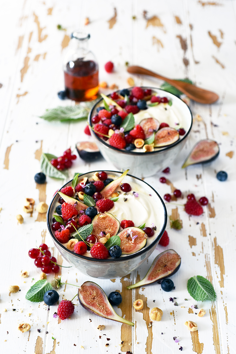 Bowls aux fruits rouges, figues, noisettes et menthe