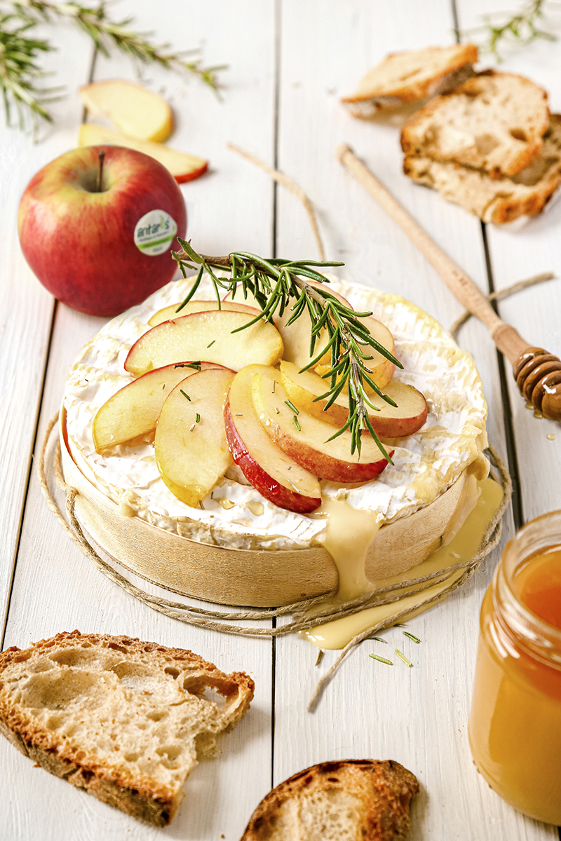 ②• Garnissez le brie avec les cubes de pommes, 1 cuillère de miel de votre choix et un peu de romarin lavé, séché et effeuillé, puis replacez le ‘couvercle’ du fromage pour refermer. Recouvrez avec les lamelles de pomme et 1 cuillère de miel.