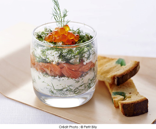 ②• Répartir la moitié de ce mélange au fond de 4 verrines, ajouter dessus des lanières de saumon fumé puis le reste de Petit Billy à la crème et finir par des œufs de saumon.