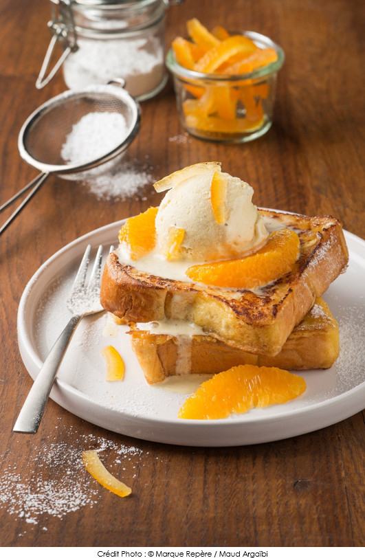 ⑥• Déposer les tranches dans les assiettes. Ajouter au centre 1 boule de glace, quelques quartiers d’orange et des zestes confits.