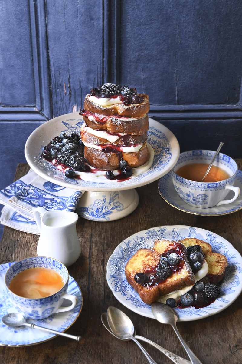 ⑥• Servez les tranches de brioche perdues avec la confiture de myrtilles tiédie, quelques myrtilles et mures fraiches et de la chantilly.