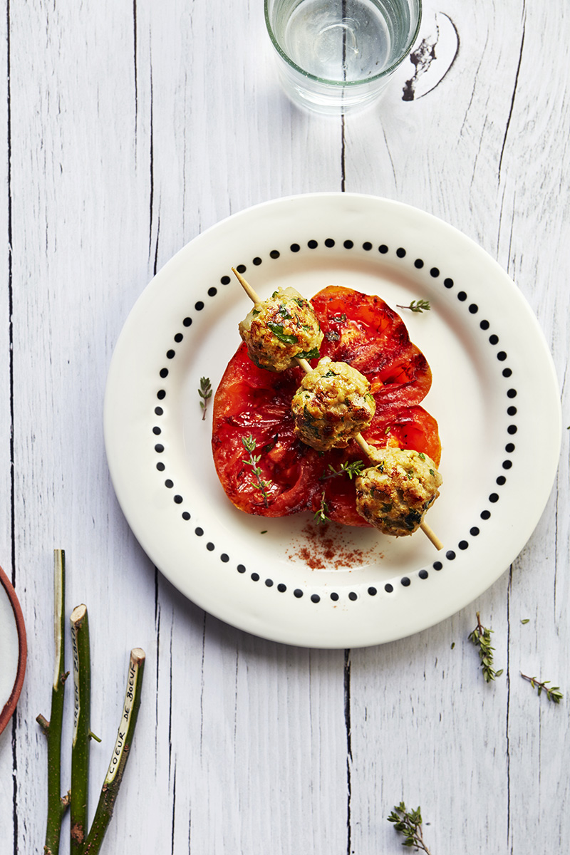 Déposer les brochettes de boulettes de veau sur les tomates grillées.