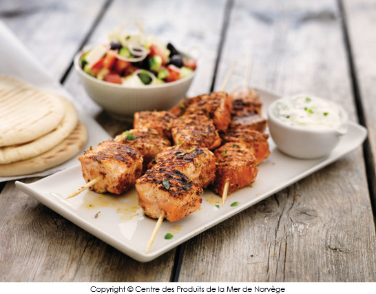 ①• Préchauffer le gril. Couper le filet de saumon de Norvège en gros cubes et enfiler quatre morceaux sur chaque brochette.
