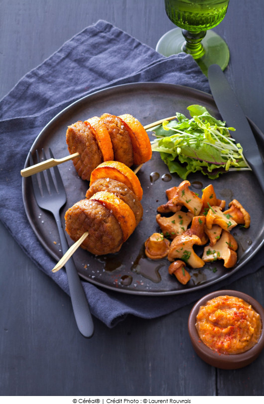 ②• Faire cuire les rondelles de steaks Grill Végétal® CÉRÉAL dans la même poêle. Monter ensuite les brochettes en alternant les rondelles de patates douces et les rondelles de steaks.