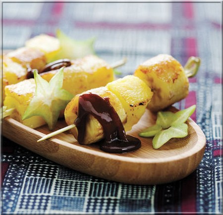 5- Intercalez les morceaux de banane et d'ananas sur des brochettes en bois.