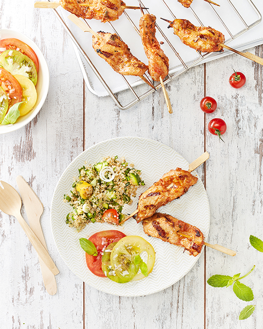 Servir les brochettes avec les salades de taboulé et de tomates.