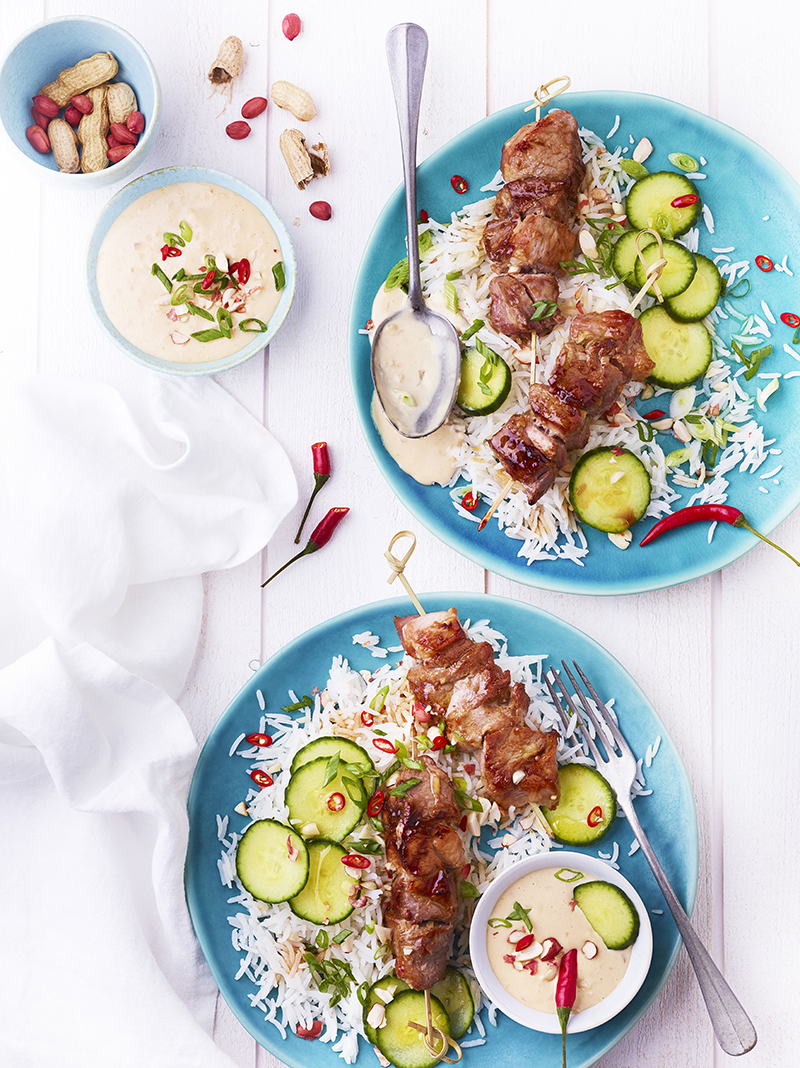 Servir les brochettes avec la sauce Satay, du riz, des lamelles de concombre et des cacahuètes concassées.