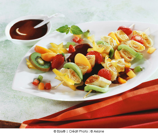 ⑥• Alternez sur des piques en bois des fraises, des rondelles de kiwis et de banane et les roulés de crêpes.