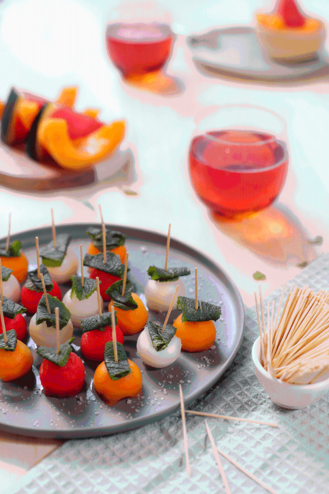 ②• Enfiler les boules sur des piques avec une feuille de menthe.