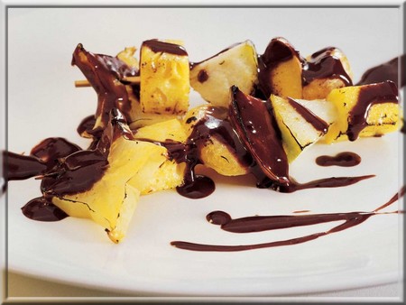 Servez les brochettes dans des assiettes nappées de chocolat.