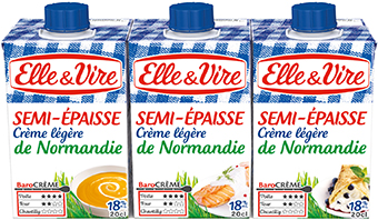 La nouvelle Crème Légère semi-épaisse de Normandie Elle & Vire comblera les gastronomes les plus exigeants. Préparée exclusivement à partir de laits normands, sélectionnés pour la richesse de leur goût et grâce à sa texture onctueuse, elle assure la touche gourmande indispensable à toutes les recettes !