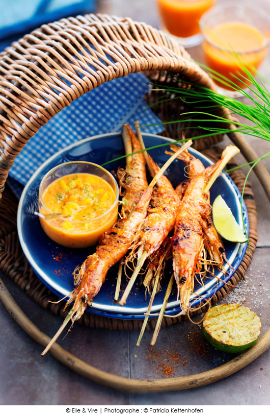 ①• Couper les bâtons de citronnelle en deux dans le sens de la longueur et embrocher chaque gambas. Les placer dans un plat.