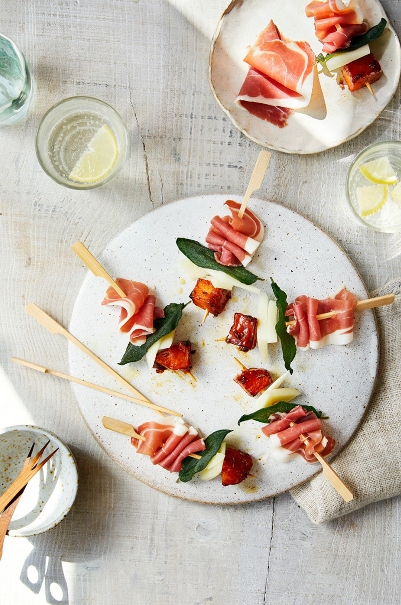 Brochettes de jambon de Parme, feuilles de sauge et courge jaune