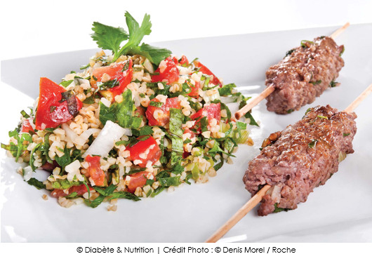Glucides : 44 g (brochettes : 2 g, taboulé : 42 g)