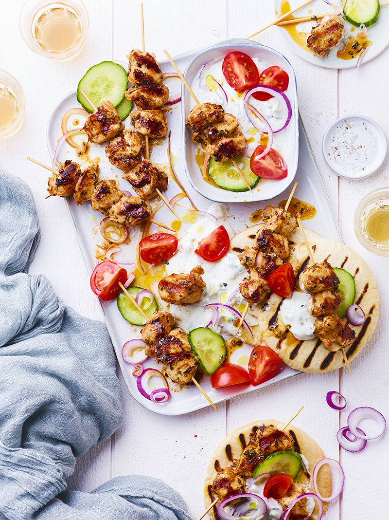 Servir les brochettes accompagnées de tzatziki, avec du pain pita, des morceaux de tomates, de concombre et d’oignon rouge.