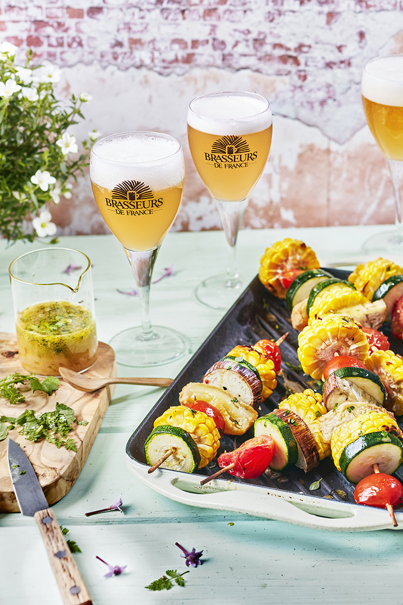 Brochettes de légumes d’été vinaigrette aux herbes et à la bière