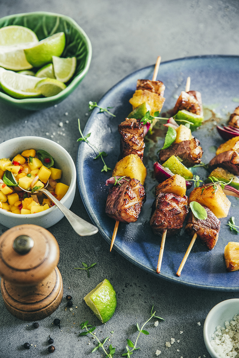 Brochettes de magret de canard à l’ananas, salsa de mangue