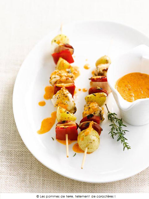 Brochettes de pommes de terre et lotte, crème de chorizo