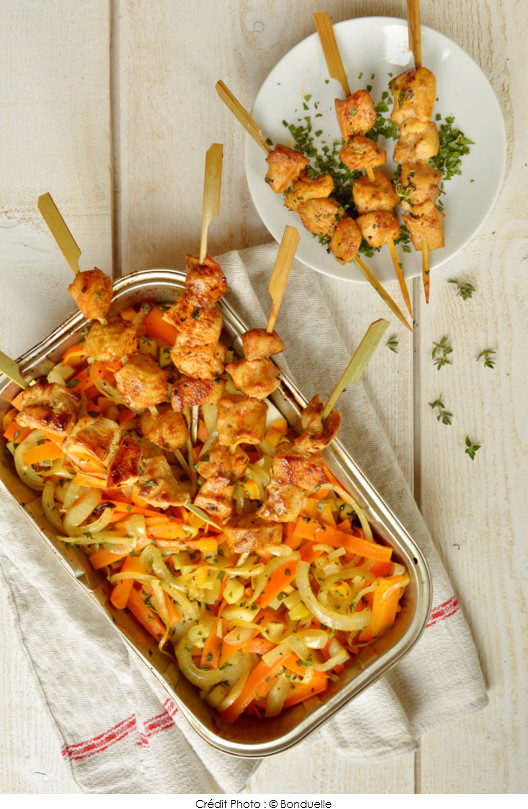 ⑤• Déposez les brochettes au-dessus des légumes et faites-les cuire directement avec les légumes, 10 à 15 minutes.