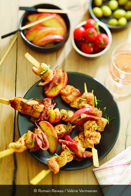 Brochettes de poulet fermier Label Rouge St Sever®, jambon de Bayonne et pommes