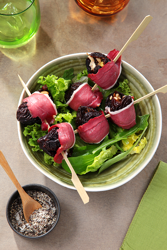 Brochettes de pruneaux farcis en habit de Magret Fumé